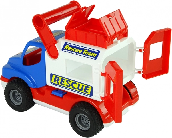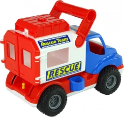 Het voertuig is uitgerust met rubberen wielen met antislipprofiel voor een soepele rit, heeft openende rode achterdeuren en een bovencompartiment voor kleinigheden. Een zijdelingse veiligheidspal houdt de opbouw stabiel – na ontgrendeling wordt de opbouw mobiel en kan met een hendel naar achteren worden gekanteld. Stickers met het thema “Rescue/Rescue Team” ondersteunen thematisch spel.