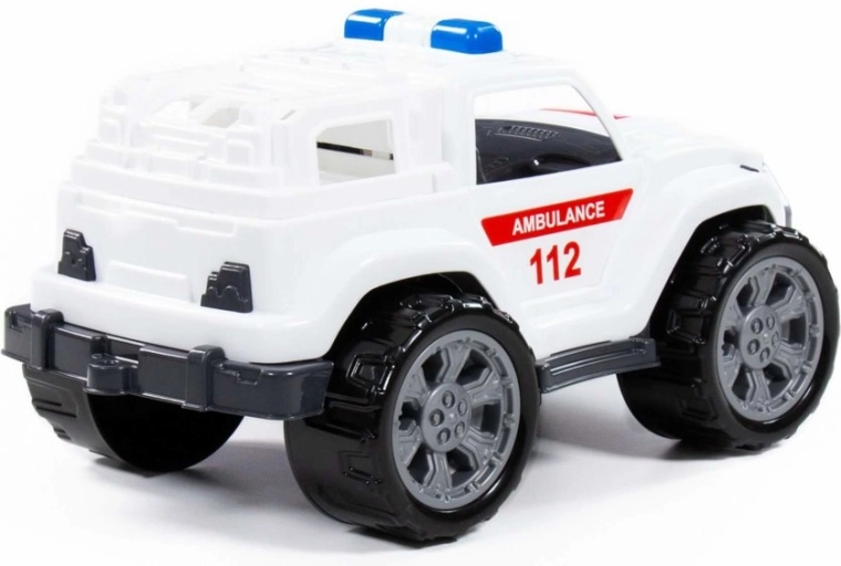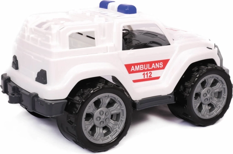 Het voertuig heeft een robuust off-road design, de grote wielen vallen van veraf al op en wekken de indruk van kracht. Aan de zijkant zitten rode stickers met de tekst Ambulance, die het voertuig karakter geven. De bestuurderscabine en de achterzijde van de wagen zijn tot in de kleinste details uitgewerkt en doen denken aan het realistische voorbeeld. Het speelgoed is een geweldige aanwinst voor elke kleine autoliefhebber, en het beroep van hulpverlener verrijkt zijn of haar verzameling voertuigen en zorgt voor veel speelplezier.