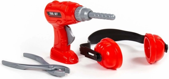 Leuke kindergereedschapsset voor kleine klussers met een rode boormachine met draaiende boor, gehoorbeschermers en een tang. Ideaal voor rollenspel, de ontwikkeling van fijne motoriek en creatief denken. Dankzij het lichte plastic ontwerp ligt het goed in kleine kinderhanden en zorgt het voor veilige, boeiende speelpret.