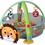 Bij spelen op de buik of rug traint het kind fijne en grove motoriek en de hand-oogcoördinatie bij het grijpen van de hangspeeltjes. De leeuw dient bovendien als praktische opbergruimte voor ballen. De set is geschikt vanaf de geboorte, voldoet aan CE en norm EN 71, en is dankzij de geschenkverpakking een geweldige keuze voor kersverse ouders.