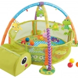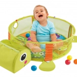 Deze veelzijdige speelmat in de vorm van een schildpad is ideaal voor de eerste levensmaanden. Het aangename, zachte materiaal en de diepe kleuren prikkelen de zintuigen, terwijl de box met mesh-zijkanten een veilige speelruimte creëert. De schildpadromp kan dienen als praktische opbergruimte voor de balletjes.