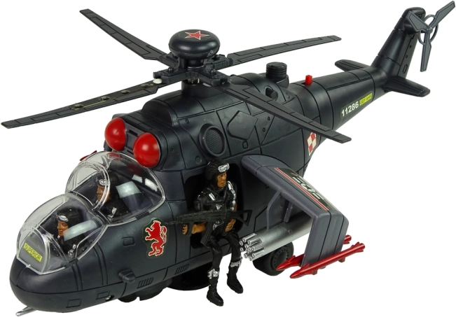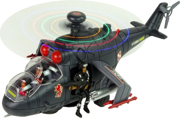 Gemaakt van stevig plastic materiaal, met enorme draaibare vleugels voorzien van gekleurde LED-lichten. Binnen in de cockpit bevinden zich soldatenfiguren - drie in de set, waarvan één met een geweer klaar voor een missie.