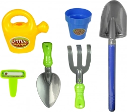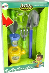 - De set omvat een emmer, bloempot, schepje, gieter, harkje en spade.