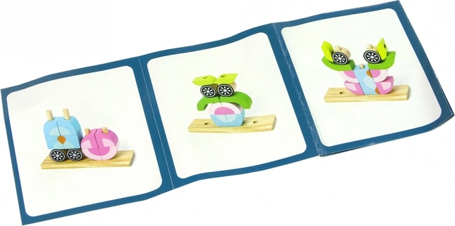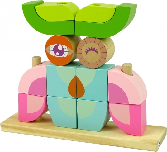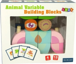 Deze set bevat een houten basis en 12 blokken die kunnen worden samengesteld tot verschillende vormen, zoals dieren of objecten. Het kind kan de blokken in diverse configuraties op de staafjes van de basis plaatsen, wat de creativiteit ontwikkelt.