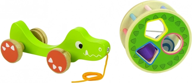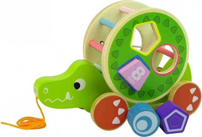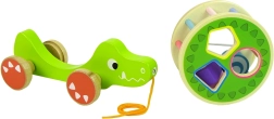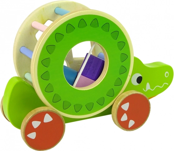 Het houten krokodilspeelgoed met sorteerder biedt een reeks educatieve elementen. De grote ring met sorteerder en drie blokken op de rug maakt het mogelijk om precisie te oefenen, geometrische vormen te herkennen en verbetert zowel concentratie als logisch denken. De krokodil is voorzien van kleurrijke stokjes die de visuele zintuigen van het kind stimuleren en de wielen met koord maken het verplaatsen van het speelgoed gemakkelijk. De blokken binnenin werken als een rammelaar, wat kinderen aanspreekt en hun gehoor prikkelt. De afneembare ring op de rug van de krokodil biedt meerdere spelmogelijkheden.