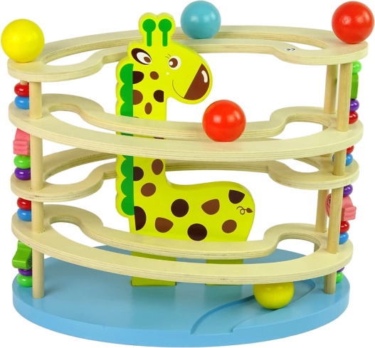 Deze kleurrijke glijbaan heeft vier niveaus waarlangs de balletjes naar beneden rollen, wat met de vorm en het vasthouden van de aandacht kinderen veel plezier geeft. Elk element is zorgvuldig gepolijst en geverfd met heldere, veilige kleuren. De houten constructie zorgt voor langdurige duurzaamheid en een speelgoed dat vele jaren meegaat.