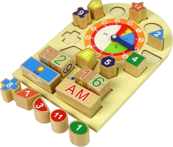 Houten educatieve klok voor de allerkleinsten combineert plezier en leren. Hiermee leert het kind vormen, kleuren herkennen en ook de klok lezen. Levendige kleuren stimuleren de verbeelding en creativiteit van kinderen.