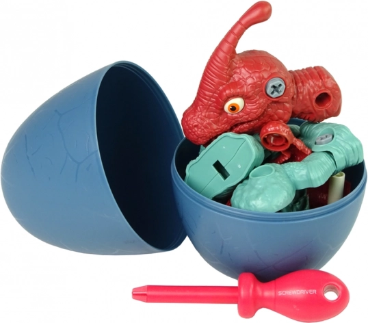 Bouwbare dinosaurus PARASAUROLOPHUS in ei met schroevendraaier. Ontwikkelt fijne motoriek en logica. Veilige kunststof, CE, EN 71. Voor kinderen 3+.