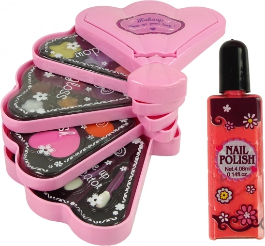 De roze cosmeticaset in de vorm van een schelp bevat vier vakjes met verschillende cosmetische producten voor het opmaken van ogen, wangen en lippen.