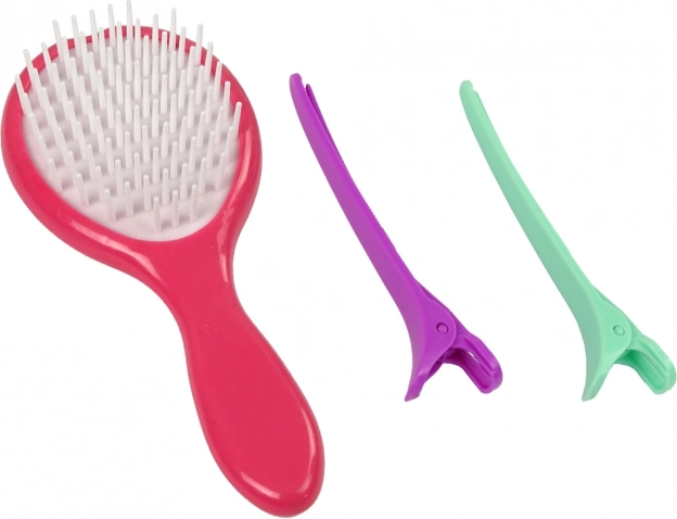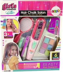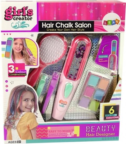 Maak kennis met de set die een borstel, een stijltang, twee haarspeldjes en zes kleurrijke haarkrijtjes bevat.