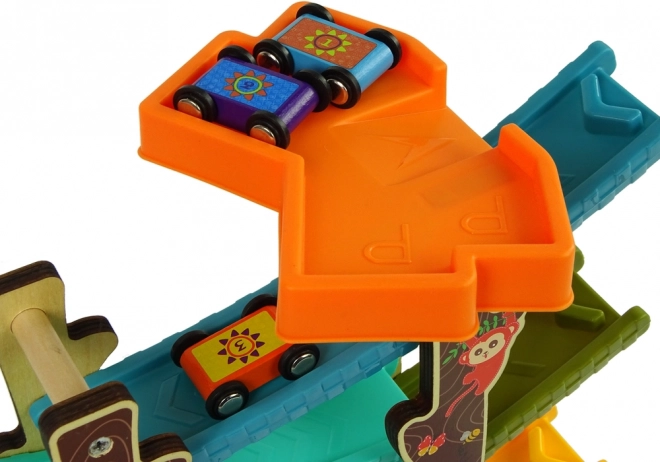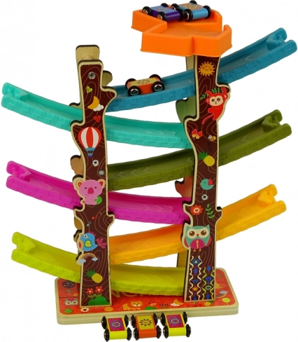 Geniet van uren speelplezier met de kleurrijke racebaan voor autootjes, ideaal voor kleine autoliefhebbers. Kinderen kunnen met de autootjes naar beneden racen en kijken hoe ze draaien en de platformen op verschillende niveaus passeren.