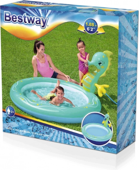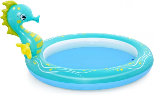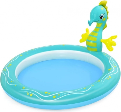 De BESTWAY opblaasbare waterspeelplaats in zeetinten biedt veilig verfrissing en volop plezier op warme dagen. Het ondiepe badje en het vriendelijke zeepaardjesmotief met watersproeier nodigen uit tot spelen en zacht verfrissen, perfect voor de allerkleinsten vanaf 2 jaar.