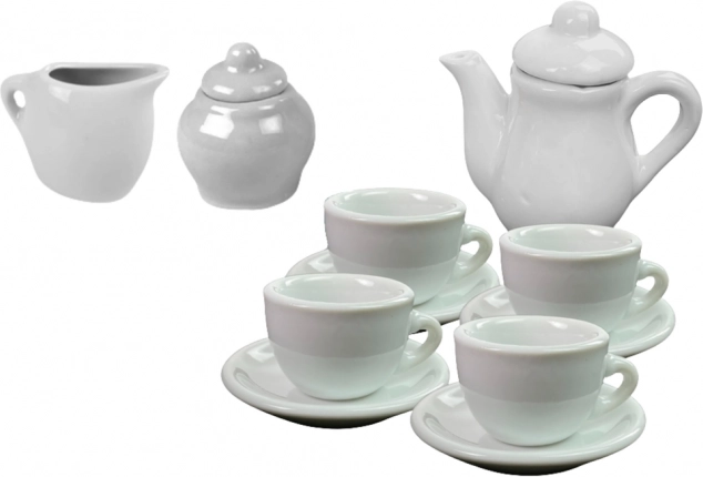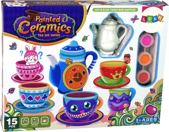 De set bevat alles wat je nodig hebt om porseleinen theeservies te versieren - van theepot tot kopjes en schoteltjes. Kinderen kunnen het servies versieren met hun eigen ontwerpen en tekeningen, wat hen in staat stelt hun fantasie volledig te benutten. Elk stuk serviesgoed wordt zo een uniek kunstwerk.