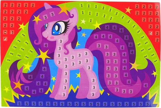 Afbeelding met een pony en genummerde vlakken voor eenvoudig gebruik bij het plaatsen van de gekleurde vierkantjes.