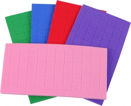 De set bevat gekleurde foam vierkantjes in vijf verschillende kleuren: roze, paars, blauw, rood en groen.