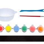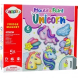 Inhoud van de set: mal met 4 eenhoorns, schelp en vleugels; verpakking gips; set van 6 verven; penseel; platte zelfklevende magneet van 15 cm x 2 cm; en een gebruiksaanwijzing.