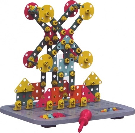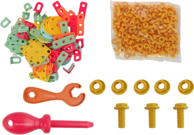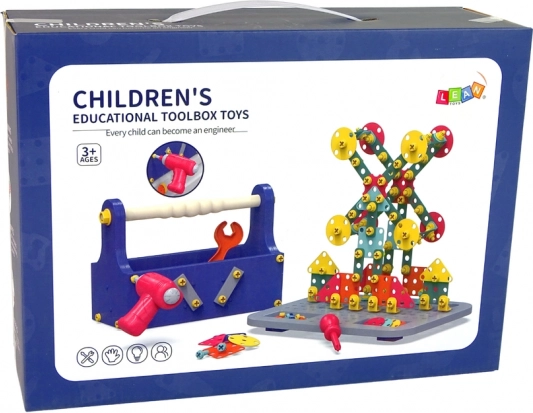 Inhoud van de set: te monteren gereedschapskoffer, accu-schroevendraaier op batterijen, constructiebord, steeksleutel, schroevendraaier, grote set moeren en bouten, platte onderdelen in de vorm van geometrische figuren.