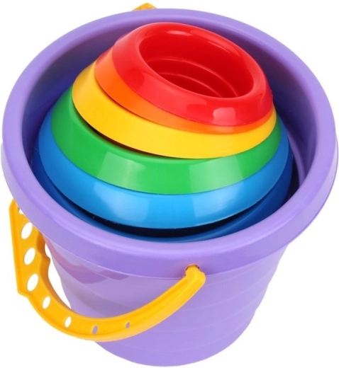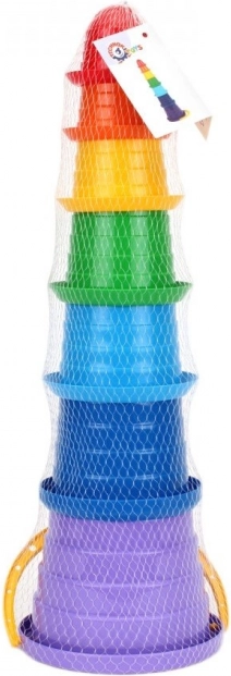 De regenboogkleurige piramide is een speelgoed dat geweldig is voor de ontwikkeling van peuters. Het bestaat uit bekers in verschillende kleuren. Bovenaan het speelgoed bevindt zich de kleinste beker. Ze zijn gemaakt van veilig, niet-giftig materiaal dat zich kenmerkt door robuustheid en duurzaamheid. De piramide heeft een sterk vereenvoudigde, afgeronde vorm, wat bijdraagt aan het veiligheidsniveau bij het gebruik van dit object.
