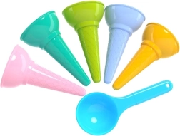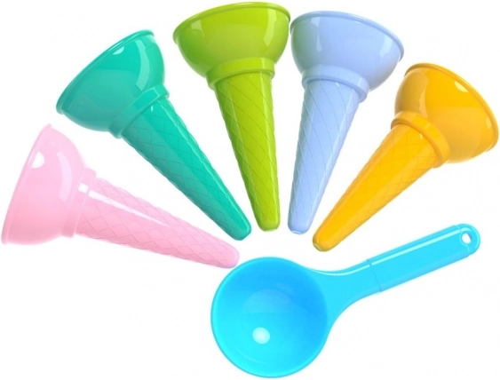 Verander zand in een klein ijssalonnetje! Deze set kleurrijke vormpjes voor ijshoorntjes met ijsschep zorgt voor uren creatief speelplezier op het strand en in de zandbak. Bevat 5 hoorntjes + een ijsschep van duurzame, geurloze kunststof in pasteltinten. Geschikt voor kinderen vanaf 1 jaar, voldoet aan de CE-certificering.
