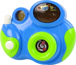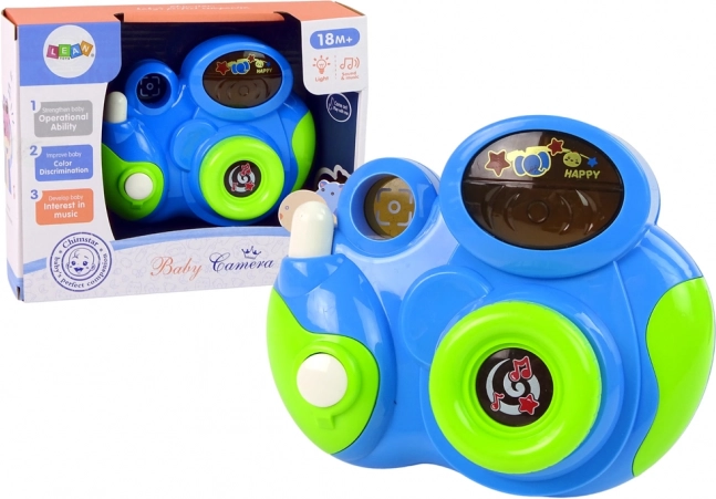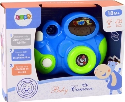 Deze leuke en veilige kindercamera helpt de allerkleinsten de wereld te ontdekken door volwassenen na te doen. Bij het indrukken van de knoppen start hij 3 melodieën, kleurrijke lichten als flitser en een realistisch “klik”-geluid. De draaibare lens ratelt bovendien aangenaam tijdens het draaien, wat nieuwsgierigheid prikkelt en de fijne motoriek stimuleert.