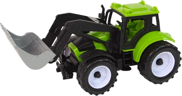 De tractor is uitgerust met een voorlader die omhoog en omlaag kan. Perfect voor het laden van “graan” of zand en het ontwikkelen van fijne motoriek.