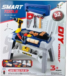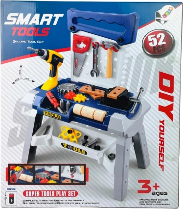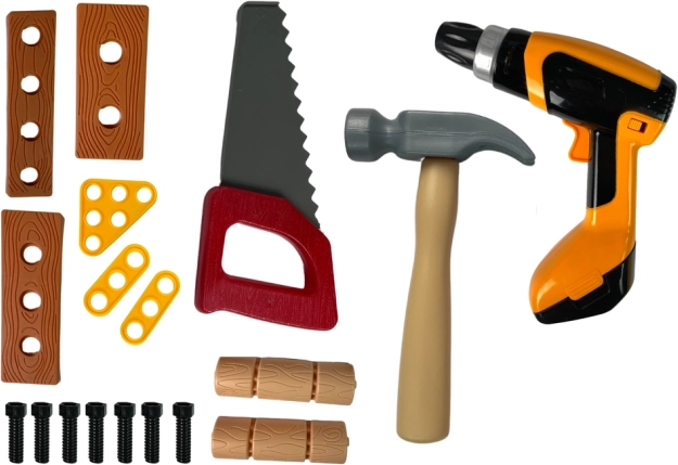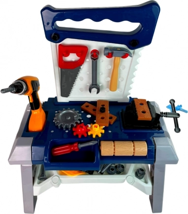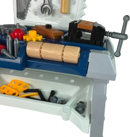 De set bevat een brede selectie gereedschappen en accessoires: inbussleutels en steeksleutels, een bankschroef, zaag, tang, hamer, schroevendraaiers, schroeven en moeren, tandwielen, houten (kunststof) plankjes om in te schroeven, zijvakken voor kleine onderdelen en haken om het gereedschap geordend op te hangen. De werkbank is eenvoudig te monteren en demonteren en neemt weinig ruimte in.