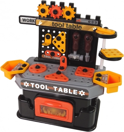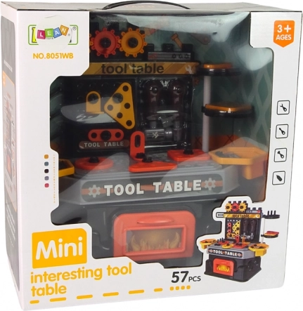 - Werkbank met gereedschapswand, opbergboxen, bankschroef, bewegende tandwielen, hamer, schroevendraaier, schroeven en moeren, haken voor gereedschap, open te maken opbergvak, elementen om vast te schroeven, werkblad met gaten