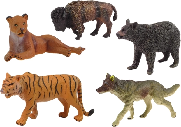 In de set vind je 6 figuren: beer, wolf, jaguar, tijger, bizon, leeuwin. Hoogte van de figuren: 10 cm x 6 cm x 4 cm. Afmetingen van de doos: 45 cm x 27 cm x 7 cm.