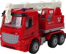 Rode brandweerwagen met witte uitschuifbare ladder en bewegende wielen. De tekst ‘FIRE CONTROL’ aan de zijkant voegt een realistisch element toe voor reddingsacties.