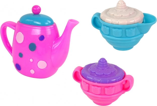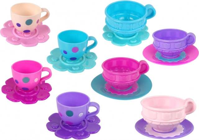 De set bevat: 4 gekleurde bekers, 4 bordjes, 4 theelepeltjes, 4 vorkjes, 4 lepels, 4 schaaltjes, een kannetje, een suikerset en een theepot.
