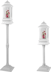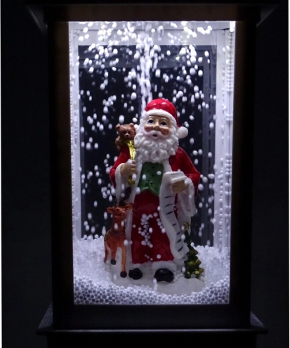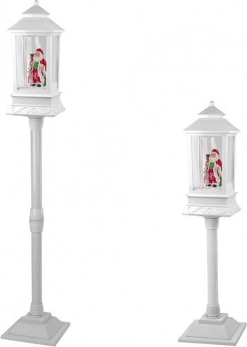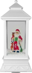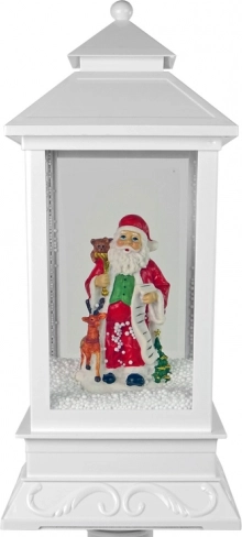 Deze elegante witte lantaarn is perfect voor je kerstdecoratie. Binnenin staat een vrolijke KERSTMAN met een zak vol cadeaus en een lange wensenlijst. Een geïntegreerde pomp laat de sneeuw vanuit de voet naar boven circuleren, waardoor het binnenin continu “sneeuwt” en een betoverend winters schouwspel ontstaat. Het stevige kunststof ontwerp zorgt voor een laag gewicht en duurzaamheid – zo kun je de decoratie elke kerst opnieuw gebruiken.