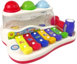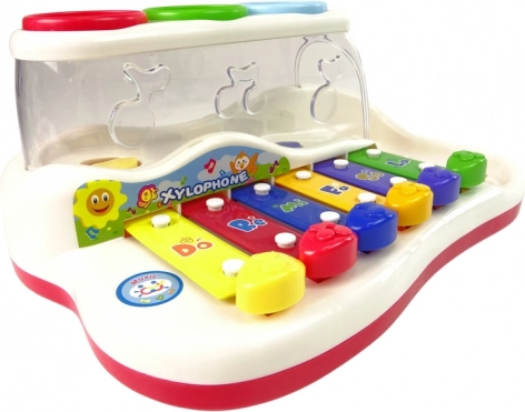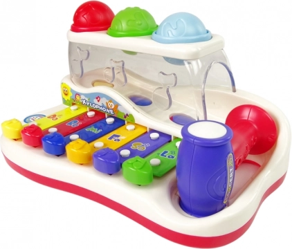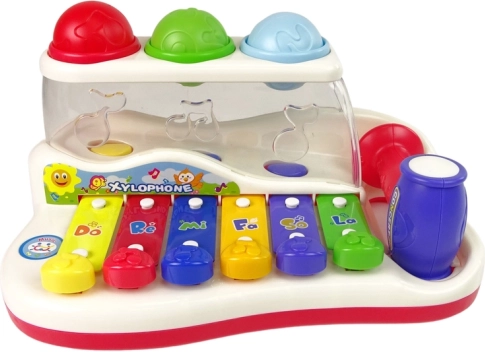 Deze kleurrijke kinderxylofoon combineert een muzikaal speeltje met een leuke kogelbaan. De toetsen in vrolijke kleuren produceren bij een tik aangename tonen en het kind leert spelenderwijs klanken, ritme en eenvoudige melodieën onderscheiden. De gekleurde ballen kun je met het hamertje inkloppen en hun baan volgen, die aan de zijkant van het speelgoed eindigt – dat motiveert tot verder spel en traint de oog-handcoördinatie.