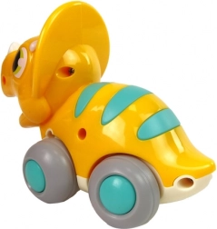 Deze kleurrijke triceratops valt op door een vrolijk design met een geel lichaam en turquoise strepen. Het terugtrekmechanisme maakt eenvoudig rijden over vlakke oppervlakken mogelijk – het kind drukt het speelgoed tegen de vloer, laat los en de dinosaurus rijdt weg, terwijl hij tijdens het rijden zijn bek opent en sluit. Een uitstekende keuze voor vermaak thuis en onderweg.