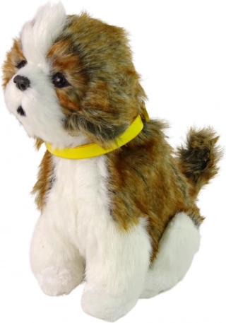 De pluchen uitvoering in wit-bruine kleur is buitengewoon aangenaam om aan te raken, terwijl de gele afneembare halsband de hond nog mooier maakt. De donkere ogen met bruine rand geven een realistische uitstraling.
