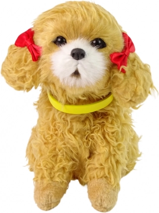 De poedel heeft bruine ogen en een gele halsband die gemakkelijk afneembaar is. Rode strikjes op de oren maken hem extra schattig.