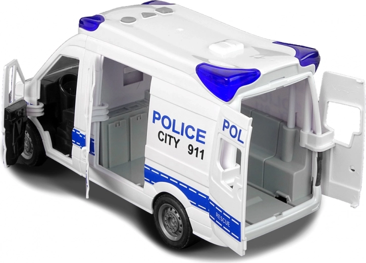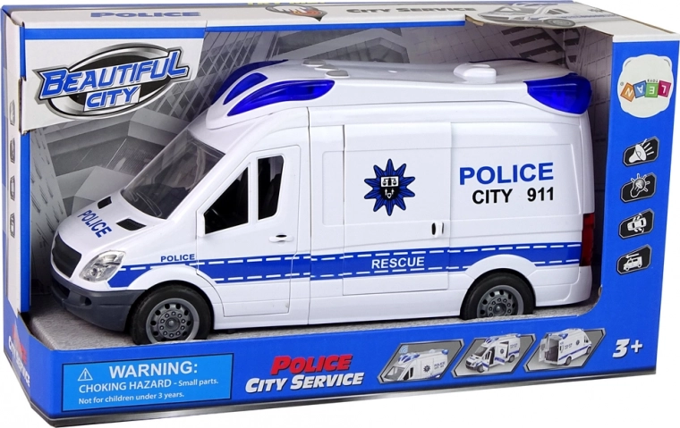 De politiewagen met sirene en blauwe zwaailichten is een keuze voor elke jonge bestuurder van de geüniformeerde dienst. De auto is volledig van kunststof, in kleuren die passen bij politievoertuigen. Het voertuig heeft een frictiemechanisme op de voorwielen waardoor het zelfstandig rijdt. Geluid- en lichteffecten worden geactiveerd met knoppen op het dak.