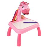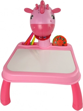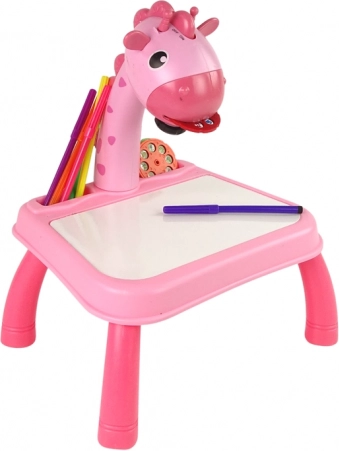 Het roze kinderprojectietafeltje met giraf projecteert 24 motieven, waardoor overtrekken en leren tekenen makkelijker wordt. In de set zitten 12 kleurstiften, een schriftje en een sponsje. Inclusief licht en 12 melodieën, een droog uitwisbaar oppervlak en instelbare scherpte voor soepel en creatief knutselen.
