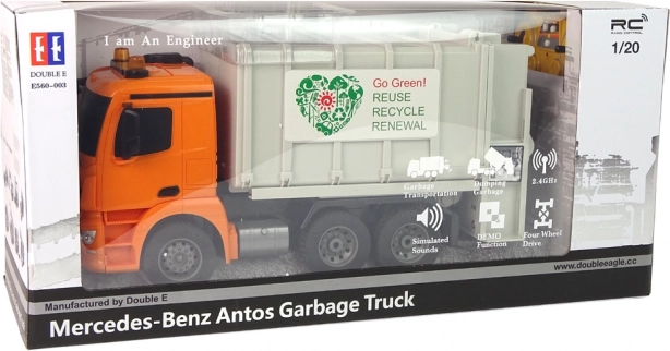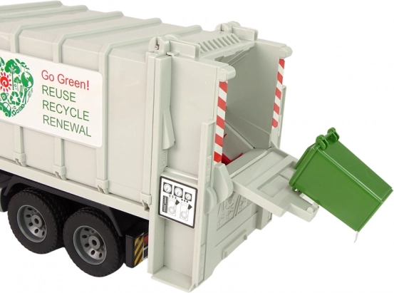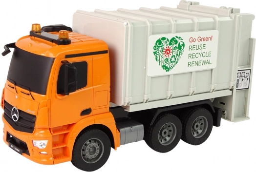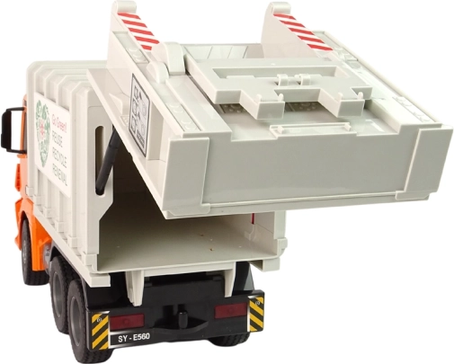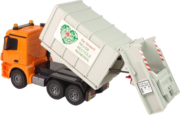 Leer kinderen spelenderwijs afval scheiden. Dit gedetailleerde model van een vuilniswagen met oranje cabine en witte container met groene recyclingelementen biedt soepel rijden vooruit/achteruit en sturen, dankzij de betrouwbare 2,4 GHz afstandsbediening. Tijdens het rijden zorgen realistische licht- en geluidseffecten voor extra beleving, inclusief het kenmerkende signaal bij achteruitrijden.