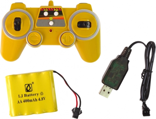 De set bevat de wagen, afstandsbediening, een USB‑lader en een accu 4,8 V 400 mAh. De controller vereist 2× AA (niet inbegrepen). Het product is van hoogwaardige, kindveilige kunststof, voldoet aan CE en norm EN 71 – een ideaal cadeau voor kinderen vanaf 6 jaar.