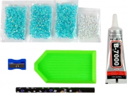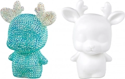 De inhoud van het pakket bevat alles wat je nodig hebt voor het maken en decoreren van je rendier, inclusief kristallen en lijm.