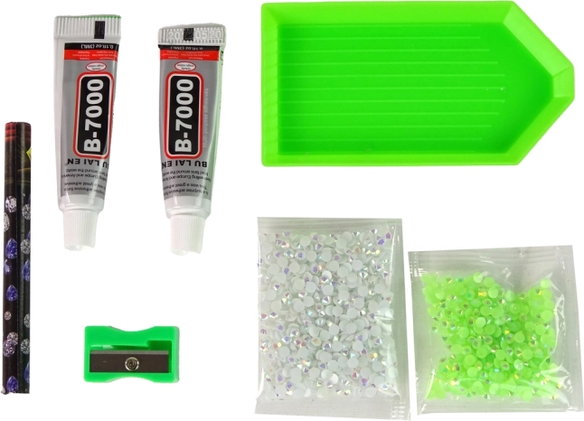 Bevat alle benodigde elementen, inclusief twee kristalpakketten, lijm, een bakje voor kristallen en een wasstokje.