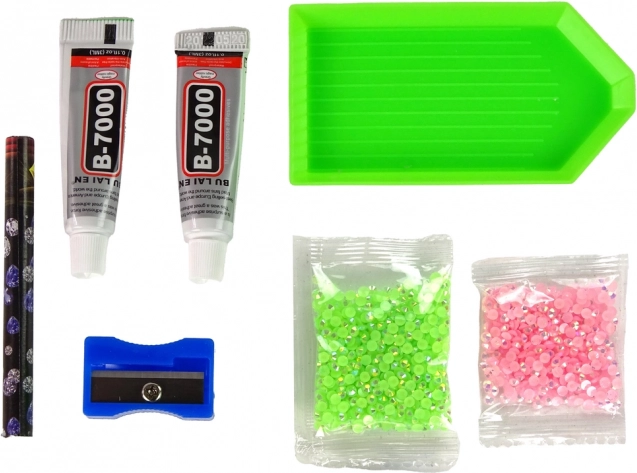 De set bevat een hertenfiguur, 2 kleuren kristallen, 2× lijm, een schaaltje, een wasapplicator en een slijpertje – gewoon openen en beginnen creëren.