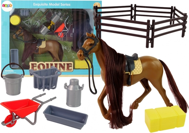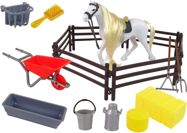Dit magische paardenfiguur met lange manen is ideaal om te kammen en vlechten te maken. De set bevat ook accessoires die nodig zijn voor het dagelijkse leven in de stal, zoals een kruiwagen, hark, vork of emmers voor water en voer. Kinderen kunnen zich verheugen op urenlang plezier terwijl ze voor hun nieuwe dierenvriend zorgen en hun verbeeldingskracht en handvaardigheid ontwikkelen.