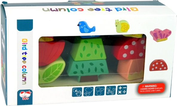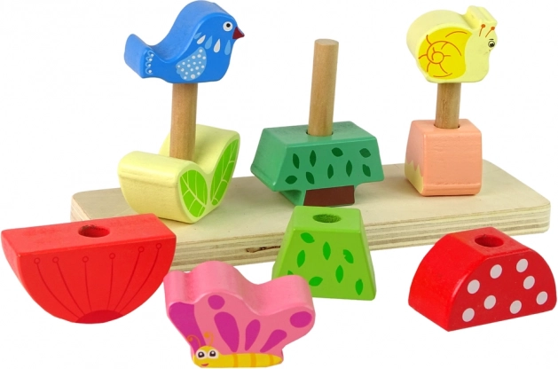 Deze houten puzzel bestaat uit een stevige basis met drie pinnen, waarop kinderen houten stukjes in willekeurige volgorde kunnen plaatsen zodat ze bij elkaar passen. De onderdelen tonen planten, vlinders en vogels – de taak is om ze correct te koppelen aan hun natuurlijke omgeving, bijvoorbeeld een vlinder bij een bloem of een vogel bij een boom. De puzzel ontwikkelt zo de verbeelding en kennis over de natuur.