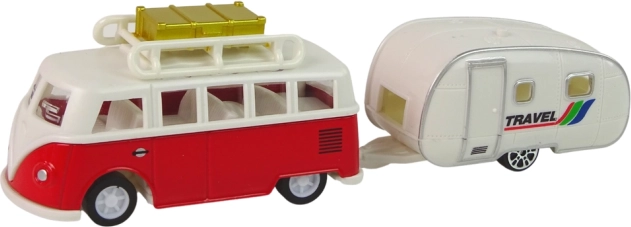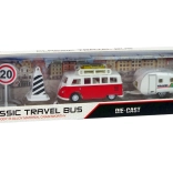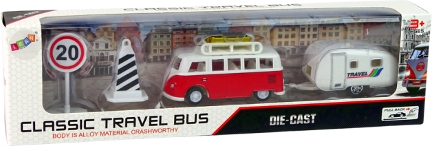 Deze set is gemaakt van hoogwaardig plastic; elk detail is zorgvuldig afgewerkt om op een echt model te lijken. De grote bus biedt plaats aan een groep figuren en het interieur is realistisch vormgegeven. Een kleine haak maakt het mogelijk de caravan te bevestigen, die dient als onderkomen tijdens het reizen. De meegeleverde verkeersborden kun je op de route van de bus plaatsen. Elk onderdeel van de set kan naar wens van het kind worden gecombineerd of afzonderlijk worden gebruikt.