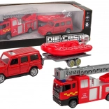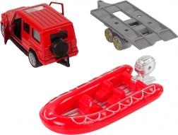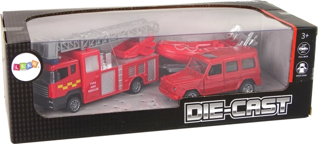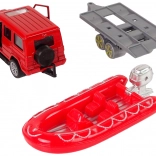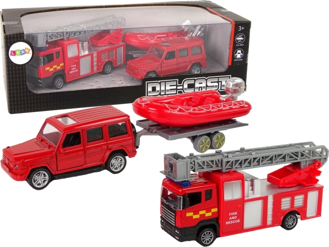 De opblaasbare boot op de aanhanger kan worden gekoppeld aan het gekozen voertuig, afhankelijk van het type redding. De set wordt aangevuld met educatieve kaarten met verschillende soorten brandweervoertuigen.