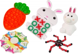 De set bevat in totaal 24 delen: boter-kaas-en-eieren (tic-tac-toe), pop-it wortel, 4 konijnenfiguurtjes, spinner + spinner Happy Easter, 3 springende speeltjes, 6 rubberen slangen, antistress konijn, 2 knijp-konijnen (squishies), 4 ringen, 2 knijp-konijnen, konijn pop-it met uitstulping en 4 vouwbare eieren. Dankzij de compacte afmetingen is de set geschikt voor op reis en voor de kleuterschool.