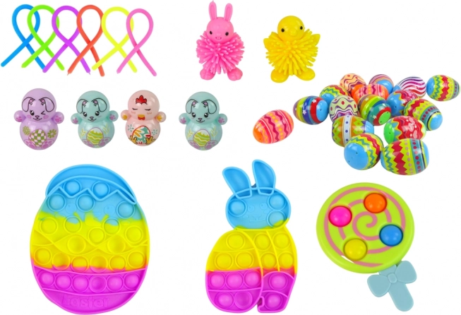 Deze paassamenstelling combineert plezier met vaardigheidsontwikkeling. Kinderen kunnen verschillende speeltjes knijpen, drukken, losklikken en uitrekken, wat helpt spanning te verminderen en de concentratie te verbeteren. De set is ideaal voor feestdagen, kleuterscholen, feestjes en knutselen thuis.