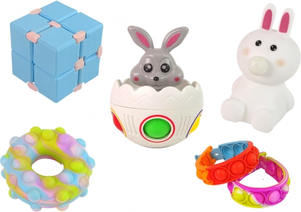 Pop it-donut, armbanden, konijn en ei, knijpfiguurtjes en een fidgetkubus – perfect voor zintuiglijk spel en stressverlichting.