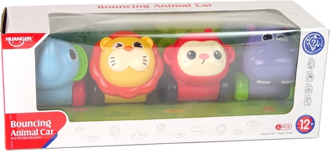 - 4 autootjes in de vorm van dieren (olifant, nijlpaard, leeuw, aapje)